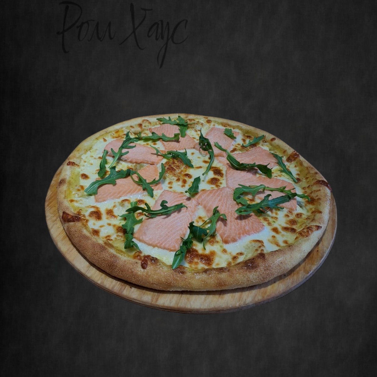 Лосось, руккола, сыр моцарелла, чесночный соус.